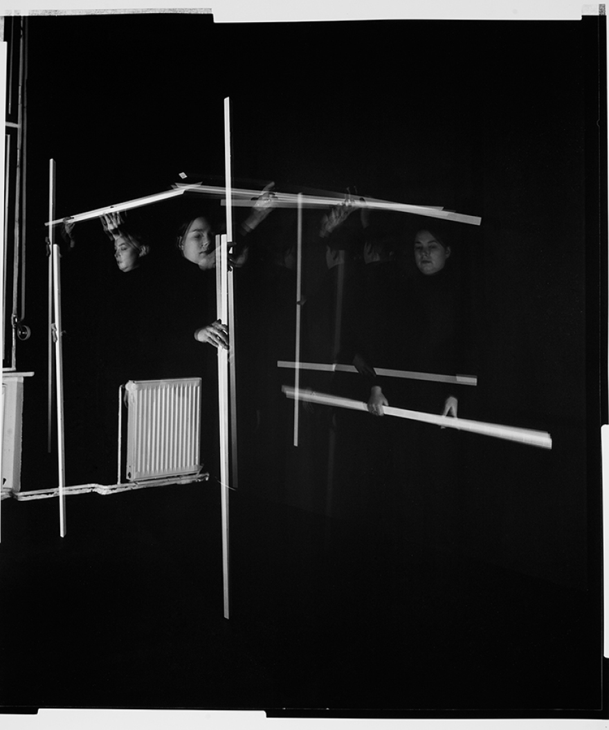 Aus dem nichts, aus dem schwarzen Bildgrund, erscheinen die Formen als isolierte Bildfragmente, per Mehrfachbelichtung ins schwarzweisse Aufnahmematerial gestanzt. Nur Licht bildet sich in der Silbergelatine ab, Licht ist alles, Schatten ist nichts. Das Bild entsteht über einen gewissen Zeitraum hinweg, Segment nach Segment, Belichtung nach Belichtung und es ist gleichgültig, in welcher Reihenfolge, nach welchem Bauprinzip das geschieht. Da kommt oben zuerst das Dach, dann eine Wand, dann eine andere. Die unteren Teile auch irgendwann. Das Haus ist in der Konzeption ja bereits fertig, steht in der Vorstellung ja schon.